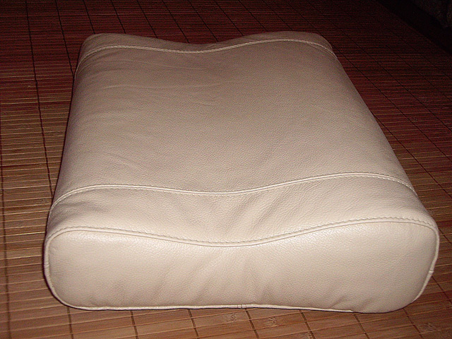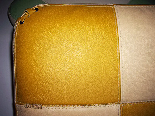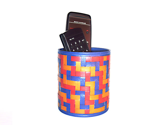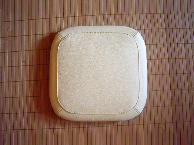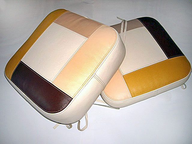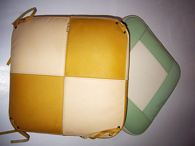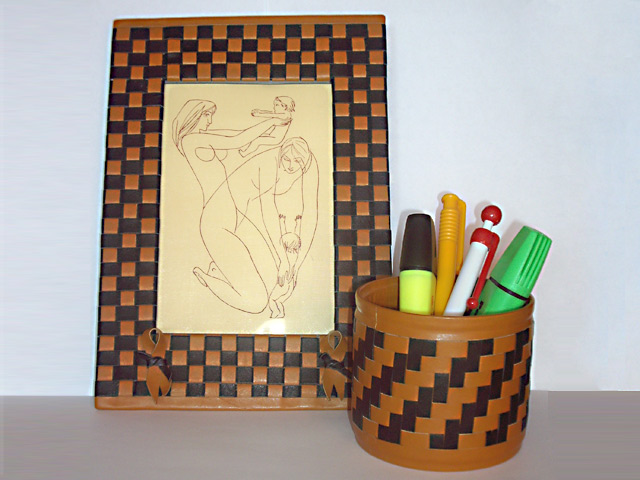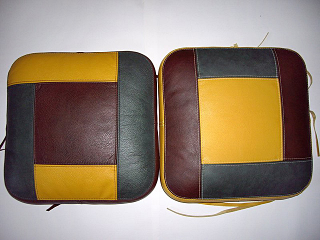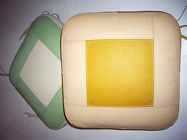Cushions. 40x40x5 cm. Leather.Jar for writing materials. Height: 6.0 cm., diameter: 10 cm. Photoframe. Height: 25 cm., width: 16 cm.